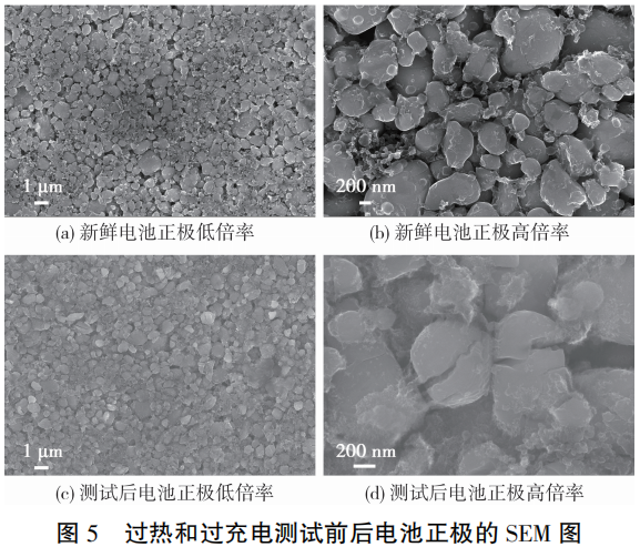 XRD分析显示,过热和过充电联合测试后电池正极活性物质是纯FePO4 相,表明电池在经历极端测试条件后,结构稳定性未发生明显变化;SEM分析表明,部分活性物质颗粒出现裂纹,但材料整体形貌相对完整。电池在测试过程中未起火和爆炸,表明磷酸铁锂锂离子电池在过热和过充电滥用条件下具有较强的耐受能力。