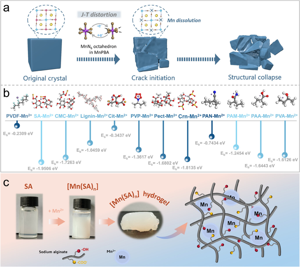 图1. 筛选合适的Mn络合物材料。a)MnPBA正极电化学失效示意图。b)不同材料与Mn2+的结合能。c)[Mn(SA)n]水凝胶的数字图像和示意图。