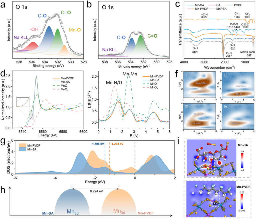 图2. 结构表征。(a)Mn-SA和(b)Mn-PVDF材料的O1sXPS。c)FTIR表征。d)MnK边归一化的XANES光谱。e)MnK边EXAFS的R空间光谱图。f)MnK边EXAFS的小波变换图(I:MnO,II:MnO2,III:Mn-SA,IV:Mn-PVDF)。g)态密度分布和(h)含有SA和PVDF粘合剂的MnPBA外层Mn3d的能隙图。i)优化模型的差分电荷密度。