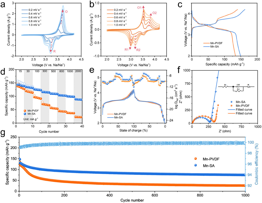 图3. 电化学测试。(a)Mn-SA和(b)Mn-PVDF在不同扫描速度下的CV曲线。c)30mAg−1下的充放电曲线。d)倍率性能。e)GITT曲线及相应的扩散系数。f)第10次循环后的Nquist图。插图为等效电路图。g)300mAg−1下的循环性能。