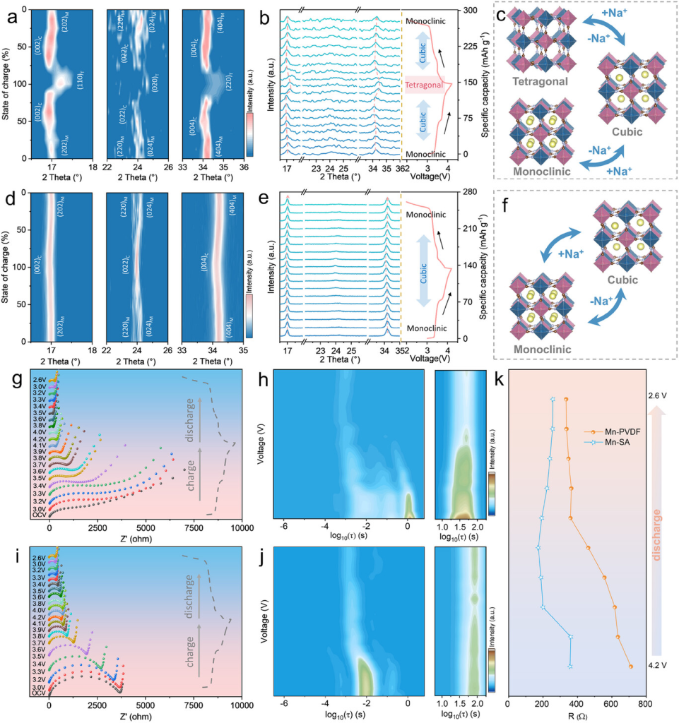 图4. 结构和动态演变的比较。a)原位XRD图谱,b)相应曲线和(c)Mn-SA电极在第一个循环过程中的相变过程示意图。d)原位XRD图谱,e)相应曲线和(f)Mn-PVDF电极在第一个循环过程中的相变过程示意图。g)Mn-SA电极的原位EIS分析和(h)DRT分析。i)Mn-PVDF电极的原位EIS分析和(j)DRT分析。k)放电阶段EIS半圆区域的电阻。