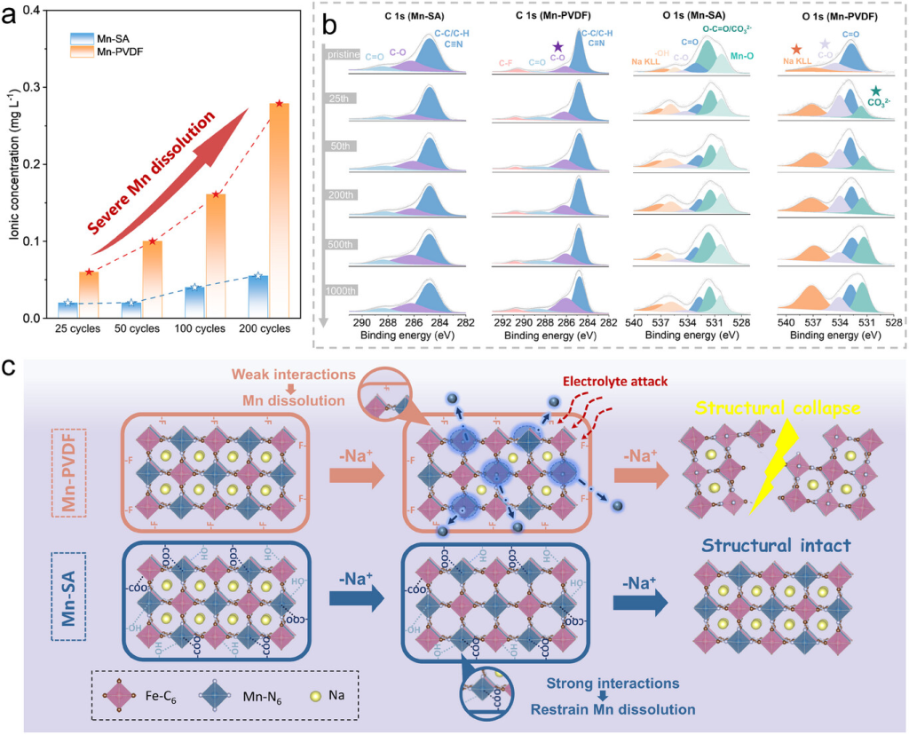 图5. [Mn(SA)n]结构对Mn溶解的抑制机理。a)不同循环后电解液中的Mn2+浓度。b)不同循环后Mn-SA和Mn-PVDF电极的C1s和O1s光谱。c)不同粘合剂对MnPBA作用机理示意图。