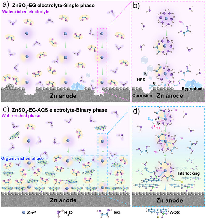 图1.a)、b)ZnSO4–EG和c)、d)ZnSO4–EG–AQS电解质中的界面结构和Zn2+溶剂化结构转化的示意图。