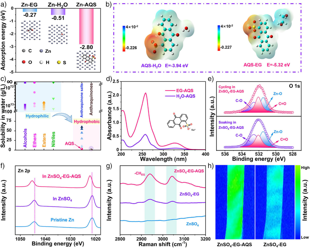 图2.负极/电解质界面处ORP层的特征。a)EG、H2O和AQS在Zn阳极上的吸附能。b)AQS与H2O和EG的结合能和分子静电势(MESP)图。c)AQS与其他典型有机分子在水中的溶解度差异。d)EG-AQS和H2O-AQS溶液的紫外可见光谱。e)在ZnSO4-EG-AQS电解质中浸泡和循环后Zn 负极的O1sXPS光谱。f)原始Zn负极和在不同电解质中浸泡3小时然后干燥的Zn2pXPS光谱。g)不同电解质中Zn负极表面的拉曼光谱。h)不同电解质中Zn负极表面的MRI图。