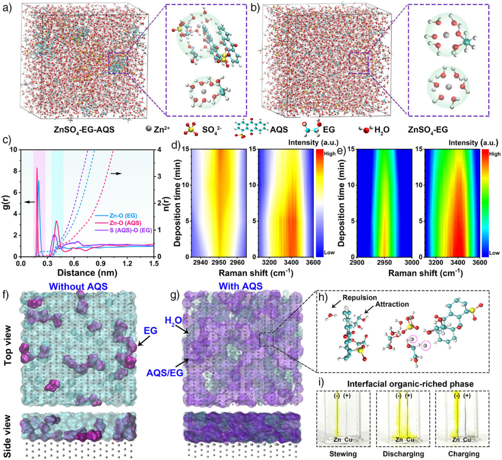 图3.溶剂化结构从电解质到ORP层的转化。a)ZnSO4-EG-AQS和b)ZnSO4-EG电解质的MD模拟快照。c)电解质中Zn2+-O(EG)、Zn2+-O(AQS)和S(AQS)-O(EG)的RDF及其相应的平均配位数。d)ZnSO4-EG-AQS和e)ZnSO4-EG电解质中Zn2+沉积过程中Zn负极表面的原位拉曼光谱。f)ZnSO4-EG和g)ZnSO4-EG-AQS电解质在电场条件下Zn负极表面的MD模拟快照。h)ZnSO4-EG-AQS电解质中负极/电解质界面上的Zn2+溶剂化结构。i)Zn负极表面ORP的光学照片。
