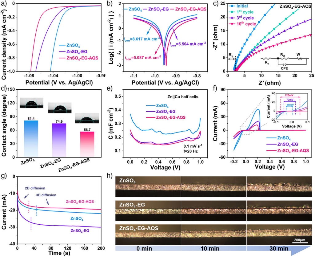 图4. Zn2+在不同电解液中的界面沉积行为。a)LSV曲线。b)1mVs−1时Zn负极的Tafel极化曲线。c)在ZnSO4-EG-AQS电解液中循环后的EIS曲线。d)不同电解液对锌箔的接触角。e)微分电容曲线。f)Zn||Cu非对称电池中Zn沉积/剥离的CV曲线。g)-150mV时Zn||Zn电池的恒电位电流-时间瞬态曲线。h)Zn2+沉积过程中的原位光学显微镜图。