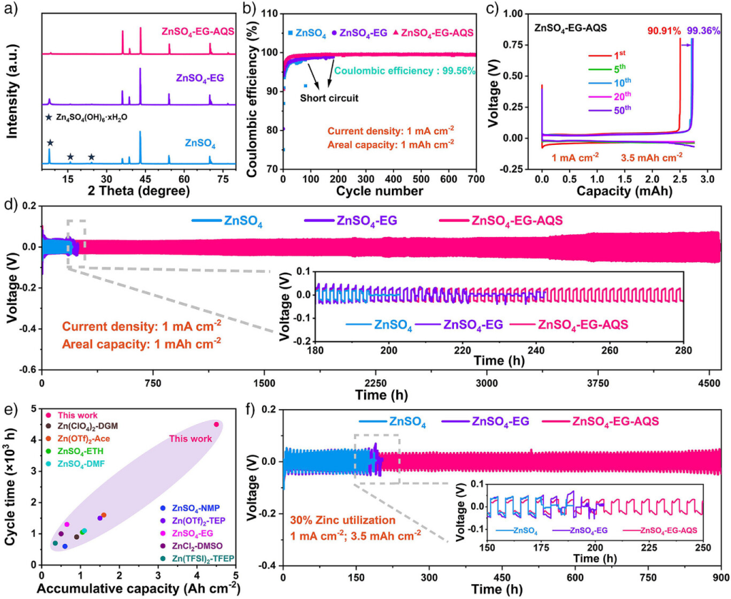 图5. 锌负极在不同电解液中的电化学性能。a)25次循环(50小时)后锌负极的XRD图谱。b)电镀/剥离过程中锌负极的库仑效率。c)ZnSO4-EG-AQS电解液中30%DOD下Zn||Cu电池的恒电流充放电(GCD)曲线。d)1mAcm−2和1mAhcm−2下Zn||Zn对称电池的循环性能。e)ZnSO4-EG-AQS电解液和其他典型有机/H2O混合电解液中Zn||Zn对称电池的累积容量和寿命比较。f)不同电解液中Zn||Zn对称电池在1mAcm−2和3.5mAhcm−2(30%DOD)下的循环性能。