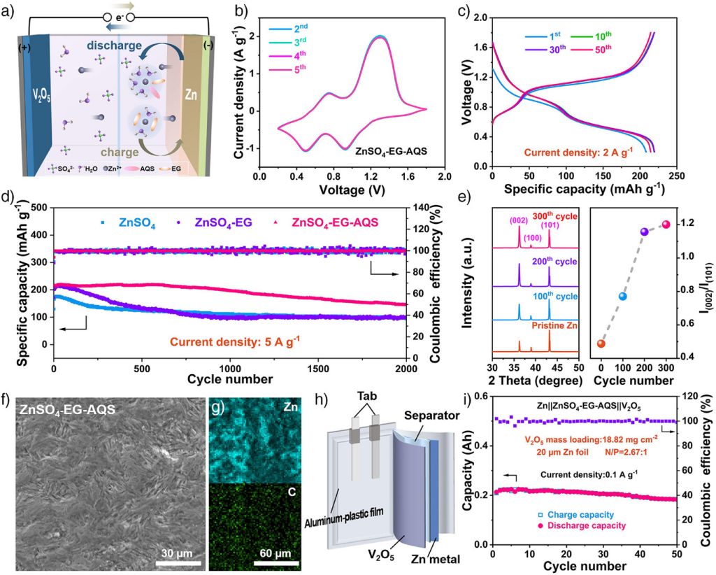 图6. 采用ZnSO4-EG-AQS电解质的Zn||V2O5电池的组装和电化学性能。a)示意图。b)1mVs−1时的CV曲线。c)2Ag−1时的GCD曲线。d)不同电解质中5Ag−1时的循环性能比较。e)Zn负极的XRD图。f)SEM图和g)在ZnSO4-EG-AQS电解质中循环后的EDX映射。h)软包电池图。i)电流密度为0.1Ag−1时Zn||V2O5袋式电池在ZnSO4-EG-AQS电解质中的循环性能。