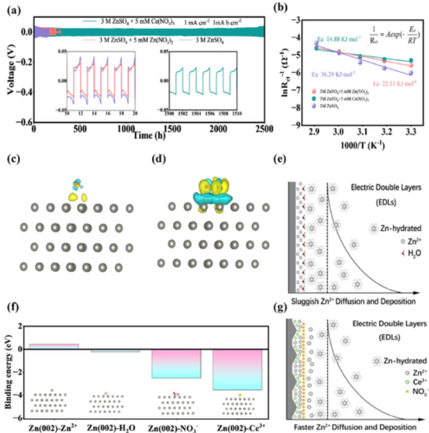 图1.a)Zn|||Zn对称电池的电压曲线,循环电流密度为1mAcm−2,容量为1mAhcm−2。b)利用阿伦尼乌斯方程确定三种电解质的活化能。c)H2O和d)NO3−在Zn(002)表面的微分电荷。f)Zn2⁺、Ce3⁺、NO3−和H₂O在Zn(002)表面的吸附能。e,g)使用纯ZnSO4和添加Ce(NO₃)₃的ZnSO4在锌表面的电双层结构。