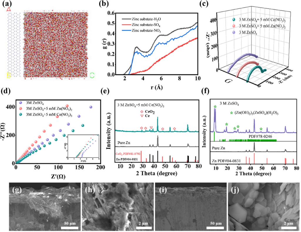 图2.a)通过AIMD模拟获得了ZnSO₄电解质和锌阳极界面的模型结构,b)通过AIMD模拟在ZnSO₄+Zn(NO3)2电解质中收集的Znic亚态-H2O、Znic亚态-SO42−、Znic亚态-NO3−的RDF。c)在3mZnSO4、3mZnSO4+5mmZn(NO3)2、3mZnSO4+5mmCe(NO3)3电解质中对称电池的EIS光谱;d)在3mZnSO4、3mZnSO4+5mmZn(NO3)2、3mZnSO4+5mmCe(NO3)3电解质中对称电池的奈奎斯特图;e)锌箔在3mZnSO₄+5mmCe(NO₃)₃电解液中浸泡20天后的XRD图。f)锌箔在3mZnSO₄电解液中浸泡20天后的XRD图。g,h)在3mZnSO4电解液中循环200次后锌阳极的顶视图和横截面SEM图,i,j)在3mZnSO4+5mmCe(NO3)3电解液中循环200次后锌负极的顶视图和横截面SEM图。
