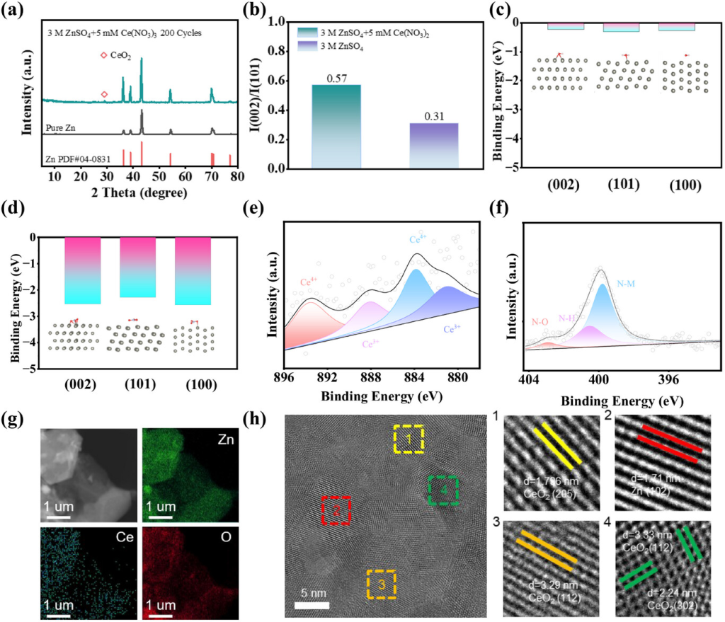 图3.a)锌负极在3mZnSO₄+5mmCe(NO₃)₃电解液中循环200次后XRD,b)(002)/(101)平面强度比较。c)比较H2O的结合能和模型,以及d)各种锌晶体表面上的NO-3。e)Ce和f)N在锌基底上经过100次ZnSO₄+5mmCe(NO₃)₃电解液循环后的XPS。g)透射电子显微镜映射和h)3mZnSO₄+5mmCe(NO₃)₃电解液循环100次后的TEM图。
