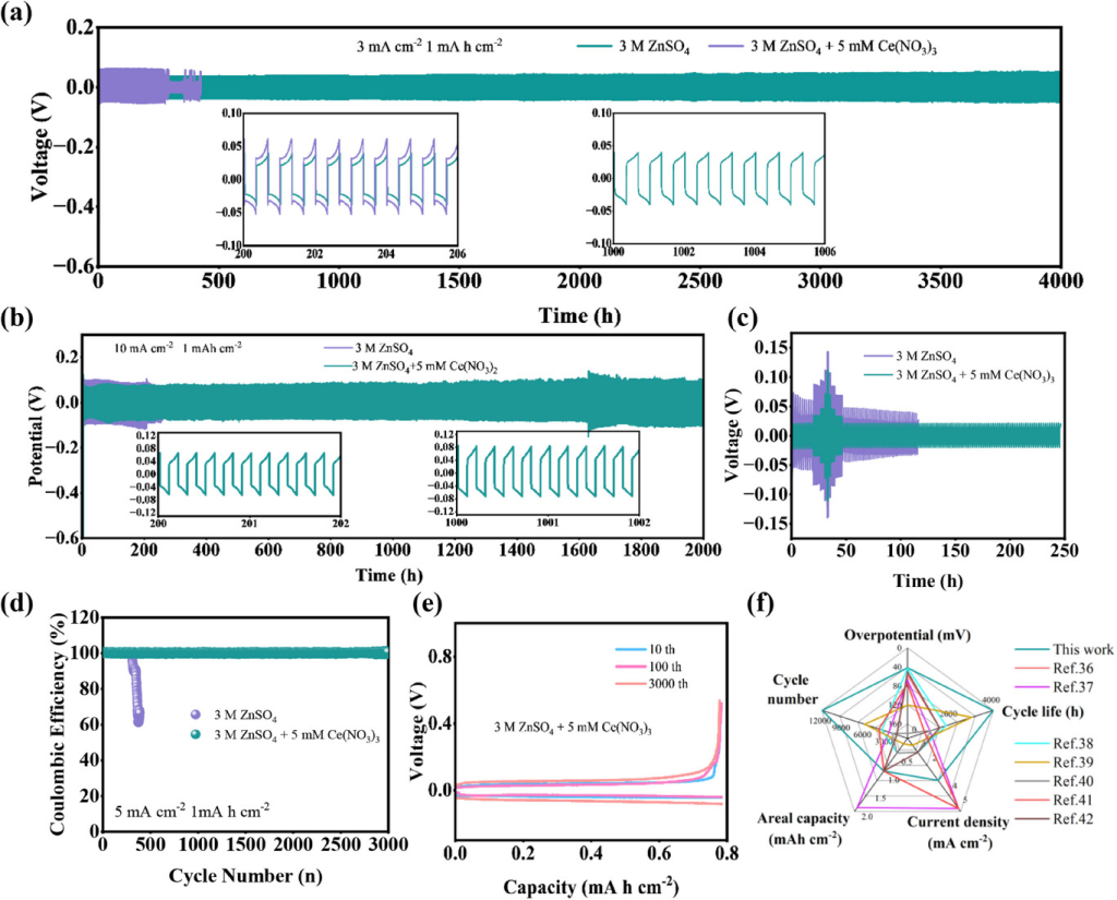 图4.a)Zn||Zn对称电池的电压曲线,(a)循环电流密度为3mAcm−2,容量为1mAhcm−2,b)电流密度为10mAcm−2,容量为1mAhcm−2;插图显示放大的电压-时间曲线。c)电镀容量为1mAhcm−2的Zn||Zn对称电池在电流密度为1、3、5、10和20mAcm−2时的倍率性能。d)5mAcm−2、1mAhcm−2时3mZnSO₄和3mZnSO₄+5mmCe(NO₃)₃电解质电池中Zn||Ti非对称电池的CE曲线。e)ZnSO₄电解质中不同循环对应的电压分布。f)基于3mZnSO₄+5mmCe(NO₃)₃电解液的Zn||Zn电池与之前文献报道的性能比较。