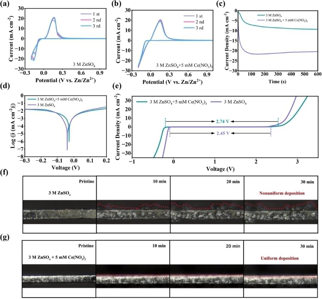 图5. 界面电化学分析。a、b)3mZnSO₄和3mZnSO₄+5mmCe(NO₃)₃电解液中5.0mVs−1的CV曲线。c)过电位为−150mV时的CA曲线。d)3mZnSO₄和3mZnSO₄+5mmCe(NO₃)₃电解液中的腐蚀曲线。e)通过LSV测试确定3mZnSO₄和3mZnSO₄+5mmCe(NO₃)₃电解液的电化学稳定窗口。在1mAcm−2的电流密度下,原位光学显微镜观察f)3mZnSO₄和g)3mZnSO₄+5mmCe(NO₃)₃电解液中Zn沉积情况。
