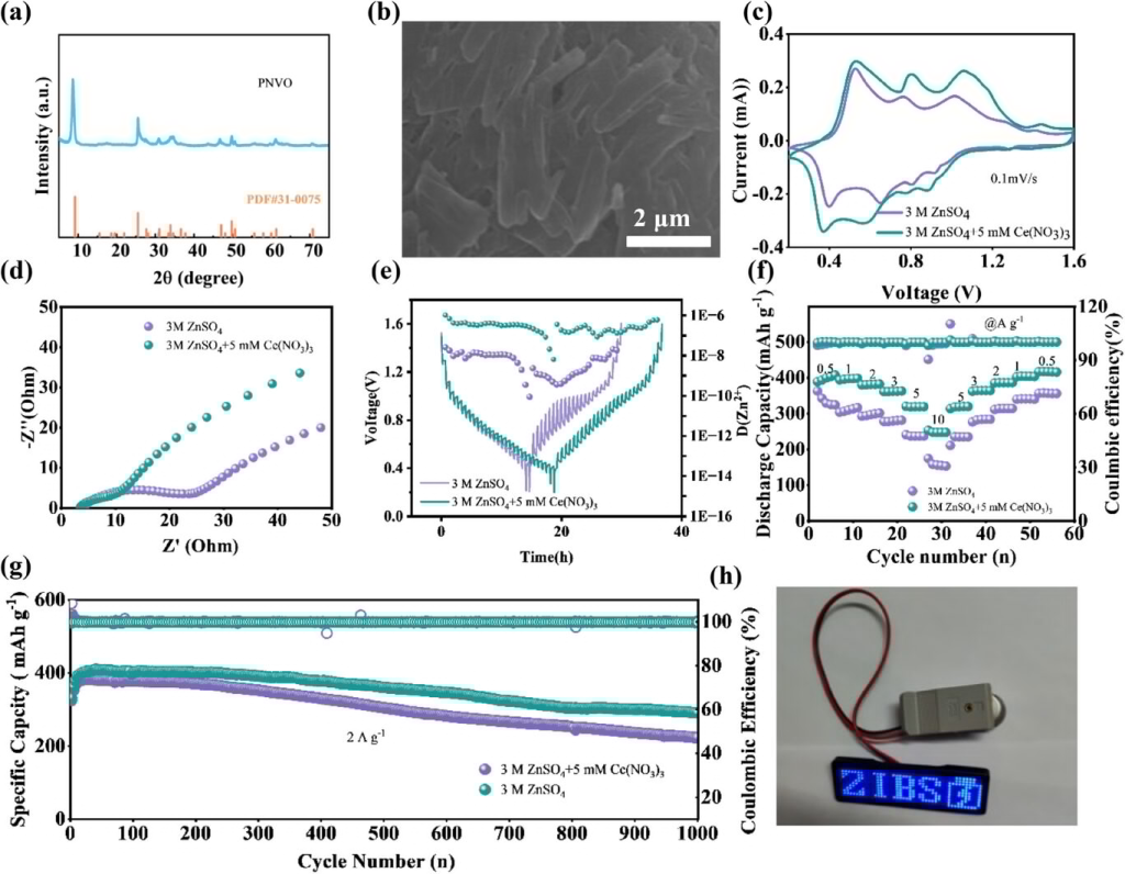 图6. Zn离子全电池的电化学性能。a)PNVO的Xrd图像,b)PNVO的SEM图像。c)Zn||PNVO全电池的EIS光谱。d)放电-充电GITT曲线和e)Zn||PNVO全电池的代表性CV曲线。扫描速率:1mV。f)Zn||PNVO全电池的倍率性能和库仑效率比较,在0.2至10Ag-1的不同特定电流下进行。g)在2Ag-1的特定电流下,长期充电/放电循环测量中Zn||PNVO全电池的容量保持率和库仑效率。h)Zn||PNVO全电池驱动LED灯组。