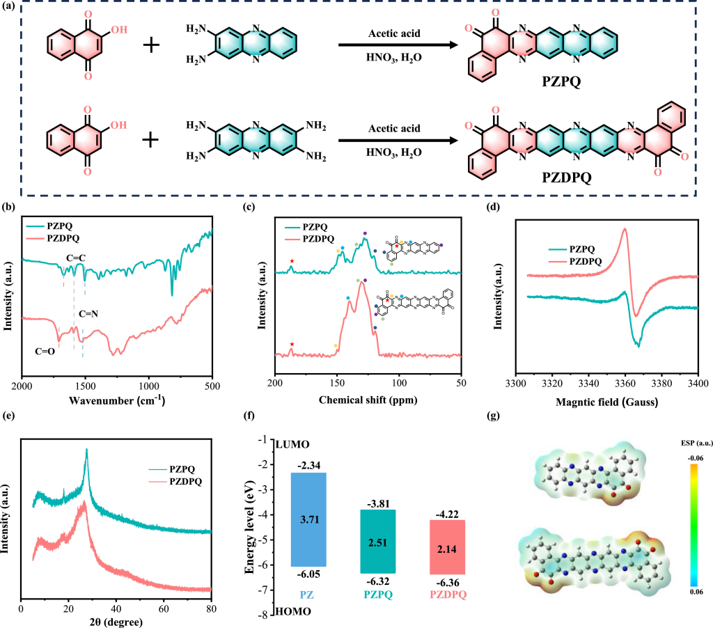 图1.PZPQ和PZDPQ的结构表征。(a)合成路线(b)FT-IR。(c)固态13CNMR。(d)EPR。(e)XRD。(f)PZ、PZPQ和PZDPQ的能带结构。(g)PZPQ和PZDPQ的化学结构和静电势(ESP)。