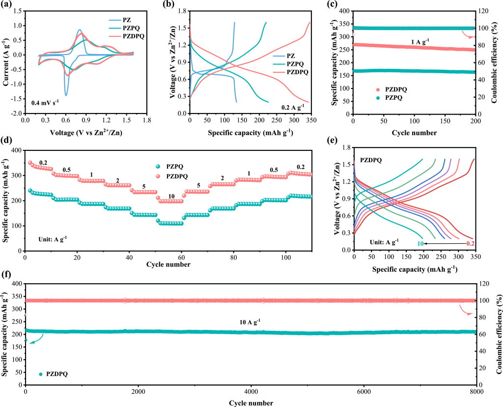 图2.PZ、PZPQ和PZDPQ的电化学性能。(a)0.4mVs−1时的CV曲线。(b)0.2Ag−1时的GCD曲线。(c)PZPQ和PZDPQ在1Ag−1时的循环稳定性。(d)PZPQ和PZDPQ的倍率性能。(e)PZDPQ在0.2至10Ag−1不同电流下的GCD曲线。(f)PZDPQ在10Ag−1时的循环性能。