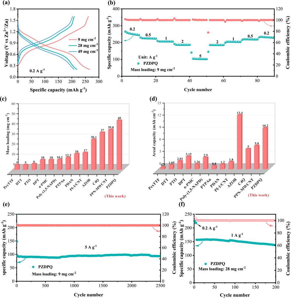 图3. (a)不同质量负载下PZDPQ在0.2Ag−1下的GCD曲线。(b)质量负载为9mgcm−2的PZDPQ的倍率性能。ZOB的质量负载(c)和面积容量(d)与已报道的有机正极的比较。PZDPQ的循环性能(e)在5Ag−1时质量负载为9mgcm−2,(f)在1Ag−1时质量负载为28mgcm−2。