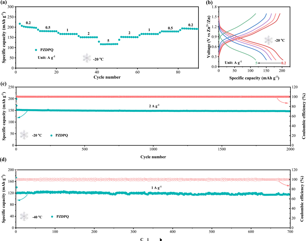 图4.(a)PZDPQ在-20℃下的倍率性能。(b)不同电流密度下PZDPQ的倍率GCD曲线。(c)PZDPQ在2Ag−1和-20℃下的长循环稳定性。(d)PZDPQ在1Ag−1和-40℃下的长循环稳定性。