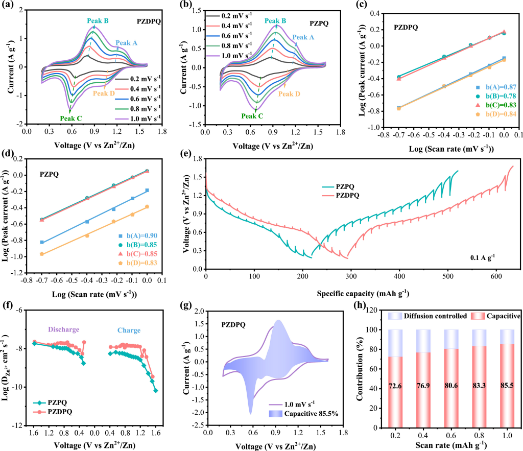 图5.(a)PZDPQ和(b)PZPQ在不同扫描速率下的CV曲线。(c)PZDPQ和(d)PZPQ的log(i)和log(v)之间的拟合线性关系。(e)PZPQ和PZDPQ的GITT曲线。(f)通过GITT计算出的PZPQ和PZDPQ的离子扩散系数。(g)1.0mV s−1时的赝电容贡献。(h)不同扫描速率下PZDPQ的电容贡献。