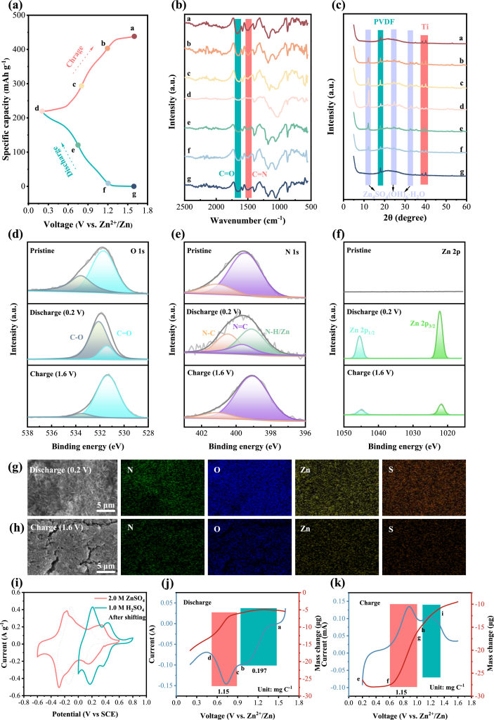 图6.(a)PZDPQ 正极的充电/放电电压曲线。(b)原位 FT-IR。(c)充电/放电过程中 PZDPQ 电极的原位 XRD 图案。不同充电/放电状态下 (d) O 1s、(e) N 1s 和 (f) Zn 2p 的原位高分辨率 XPS 光谱。完全放电 (j) 和充电状态 (h) 下的 PZDPQ 电极的 SEM 图像。(i)分别通过三电极系统测量的 1.0 M H2SO4 水性电解质和 2.0 M ZnSO4 水性电解质中 0.2 mV s−1 的 PZDPQ 的 CV 曲线。虚线表示在 1.0 M H2SO4/H2O 中的相应 CV 曲线,经过移动以模拟在 pH 约为 4.5 的稀 H2SO4 电解质中的作用。 PZDPQ在放电(j)和充电(k)过程中的EQCM测试结果。