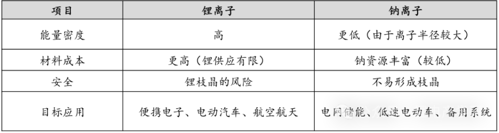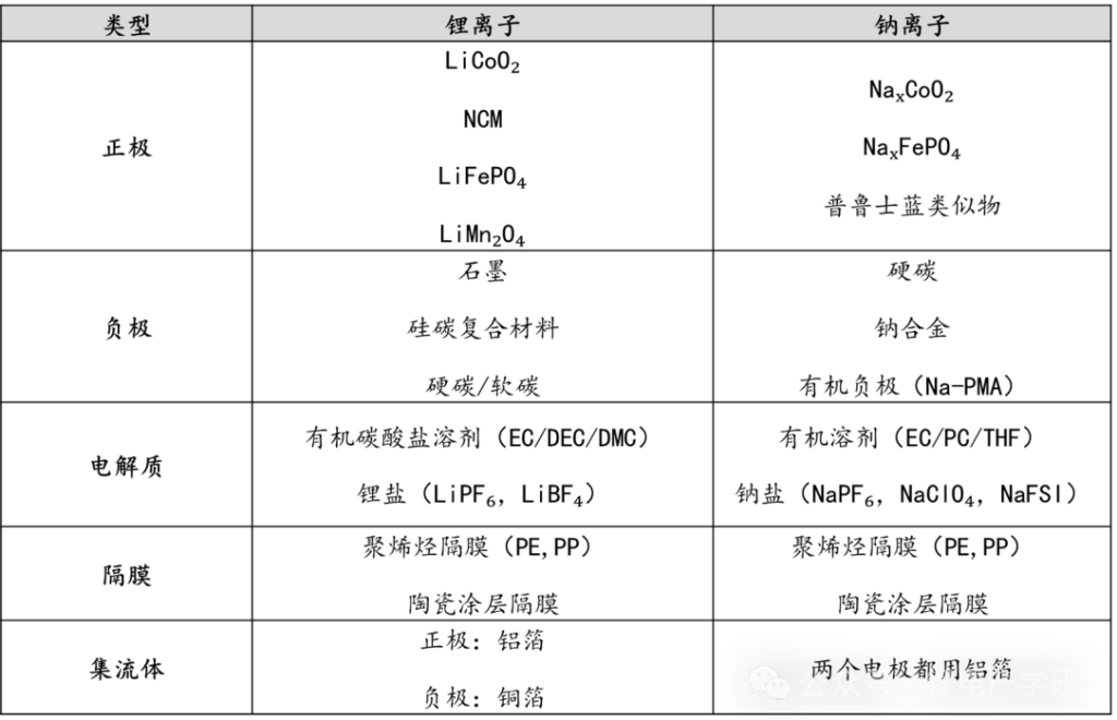 钠离子电池和锂离子电池关键组件对比