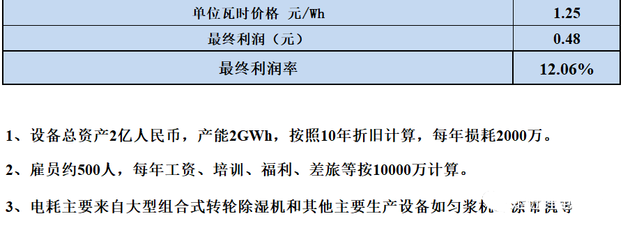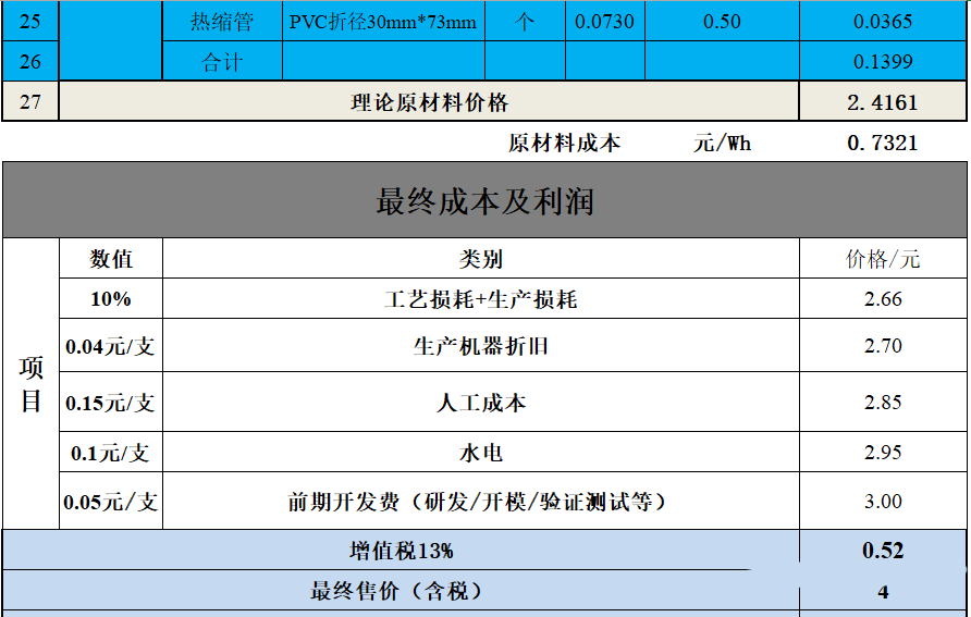 从数据中可以看出,该款电芯材料成本0.73元/Wh,售价成本1.25元/Wh。