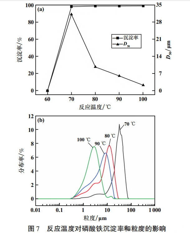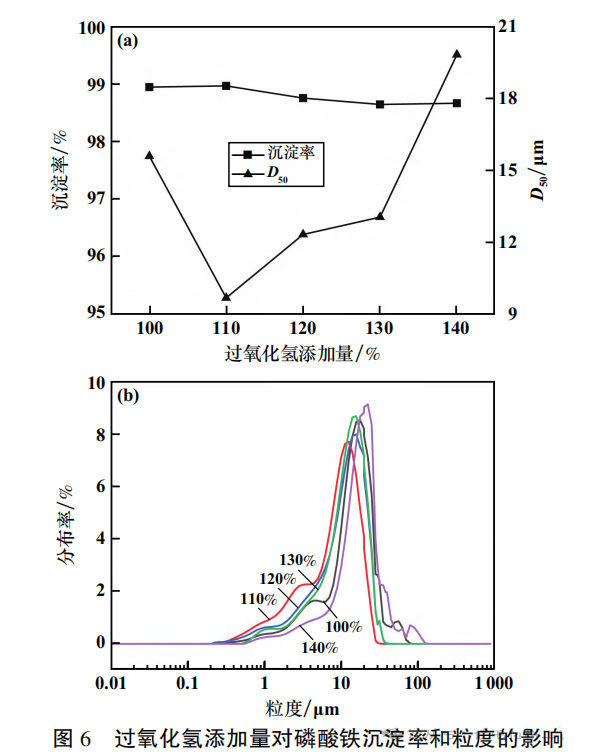 反应温度80℃、反应时间1h、过氧化氢1h内每20min添加一次、搅拌机转速350r/min,过氧化氢添加量对磷酸铁沉淀率和粒度的影响如图6所示。由图6可知,过氧化氢添加量为理论值的100%~140%范围内,其对磷酸铁沉淀率影响不明显;过氧化氢添加量110%时,磷酸铁粒度分布更集中且磷酸铁 D50最小(约9μm)。 适宜的过氧化氢添加量为理论值的110%。