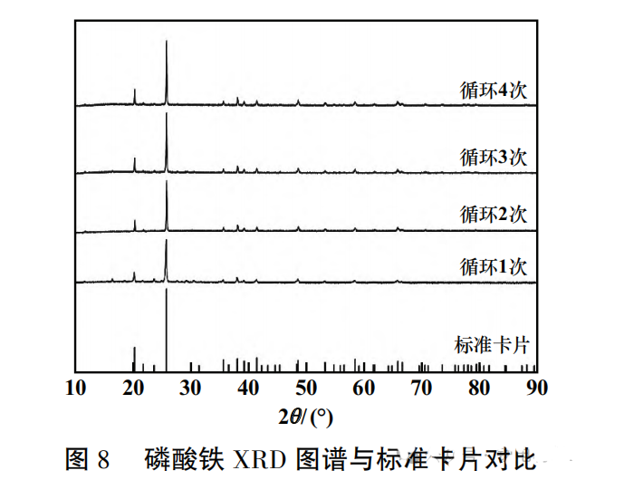 各批次循环制备的磷酸铁XRD图谱与标准卡片对比如图所示。对比结果表明,制备的磷酸铁样品衍射峰明显。