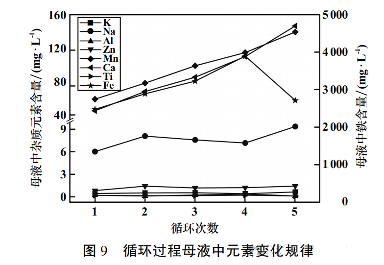 下图为母液循环过程中逐批次的杂质元素含量变化曲线。由图可以看出,经过多次循环,母液中K、Na、Al、Zn元素未出现明显富集现象,Fe元素含量在正常合理范围内波动,Ca、Mn元素含量随着循环次数增加而增加,母液经过4次循环未影响磷酸铁样品沉淀及其质量。