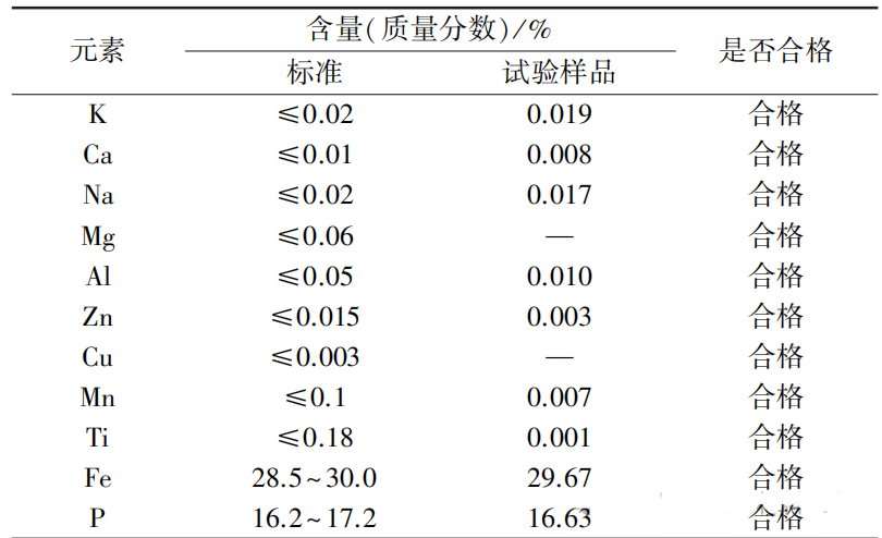 在适宜试验条件下母液经过4次循环制备的磷酸铁中各元素含量如表所示。由表数据计算可知,水合磷酸铁中铁含量为29.67%,磷含量16.63%,铁磷物质的量比为0.9893,均达到HG/T4701—2021标准要求。使用电感耦合等离子体发射光谱仪测定循环5次样品杂质含量,测定的水分含量为19.46%,达到标准要求。