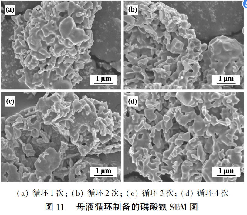 图为母液多次循环制备的磷酸铁SEM图。从图中可以看出,母液循环4次对磷酸铁样品并无影响,磷酸铁形貌均符合标准要求。