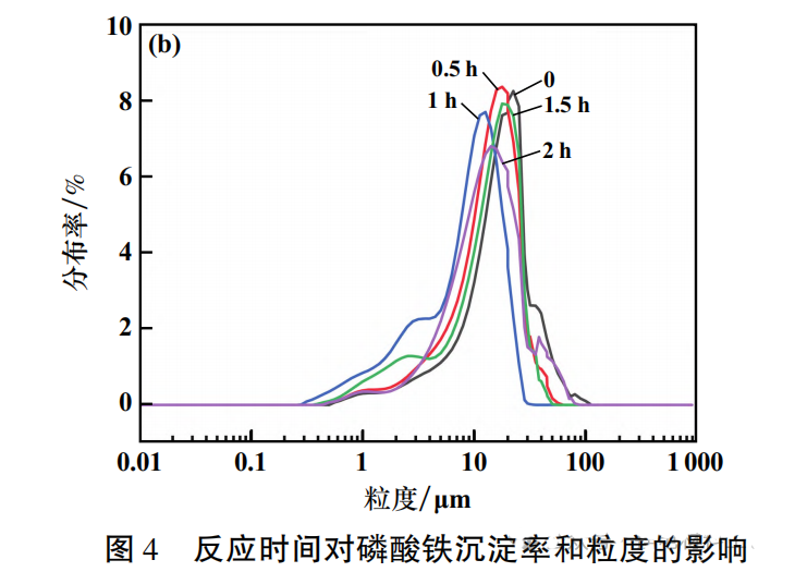 反应温度80℃、过氧化氢添加量为理论用量的110%、过氧化氢采用间断添加、搅拌机转速350r/min,完成过氧化氢添加后计时,反应时间对磷酸铁沉淀率和粒度的影响见图。由图可知:0~2h范围内,反应时间对磷酸铁沉淀率的影响不大;0~1h范围内,随着反应时间延长,磷酸铁粒度持续减小,1h时磷酸铁D50粒度约9μm,反应时间超过1h后,磷酸铁粒度增大;反应时间1h时磷酸铁粒度分布更集中。适宜的反应时间为1h。