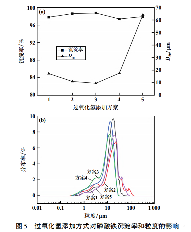 反应温度80℃、反应时间1h、过氧化氢添加量为理论用量的110%、搅拌机转速350r/min,过氧化氢添加方式对磷酸铁沉淀率和粒度的影响如图所示。5种过氧化氢添加方式如下。方案1:0.5h内每15min添加一次;方案2:1h内每30min添加一次;方案3:1h内每20min添加一次;方案4:1h内每15min添加一次;方案5:1h均匀持续滴加。由图可知,不同过氧化氢添加方式对磷酸铁沉淀率影响不显著;方案1、方案2、方案3和方案5所得磷酸铁粒度分布较为集中,而方案4所得磷酸铁粒度分散性很大。方案3所得磷酸铁D50最小,约9μm。结合添加方式对沉淀率的影响规律,适宜的添加方式为方案3,即1h内每20min添加一次。