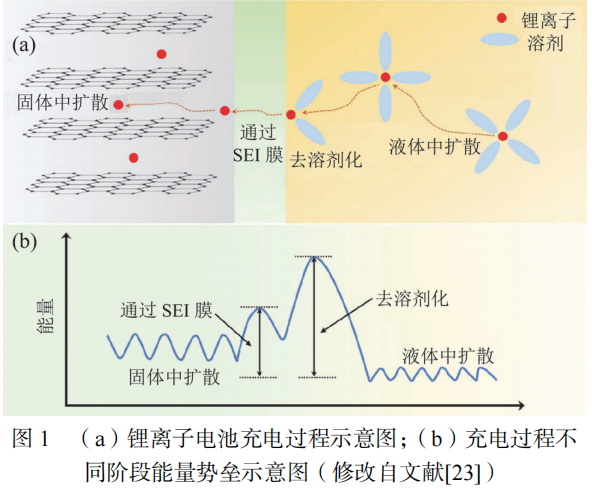 锂离子电池在充电过程中需要克服相应的能量 势垒方可实现锂离子的移动,如图1(b)。其中去溶剂化过程需要的能垒最大,其次是锂离子在SEI膜中的扩散。在锂离子电池慢速充电过程中能量势垒对电池的影响相对较小,而当电池需要实现快速充电时,这些在慢充过程中可忽略的因素将严重影响电池的快充性能。