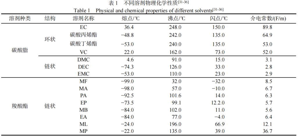 当前锂离子电池用电解液溶剂主要包括具有链状和环状结构的碳酸脂类及羧酸酯类,各溶剂的物理化学性质见表1。