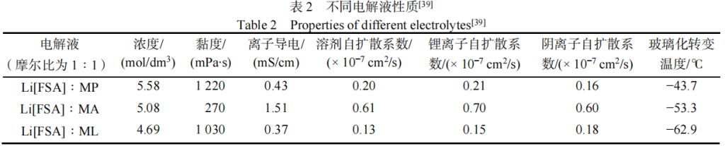 有机液体电解液中存在Li+ 、阴离子和溶剂分子,这三种物质的自扩散系数关系为Li+<阴离子<溶剂。虽然Li+半径最小,然而Li+会与溶剂分子形成溶剂化的Li+而导致具有更大的半径,这将显著降低Li+的扩散速度。电解液溶剂在常温下熔点越低,黏度越小,这对溶质在溶剂中的扩散越有利。因此,溶质在低熔点溶剂中的扩散速度将越大。KONDOU等以双氟磺酰亚胺锂(Li[FSA])为溶质,溶解到不同溶剂中构成电解液,其中电解液的浓度为1mol/L。不同种类电解液的物性参数见表2。