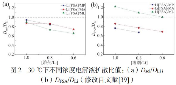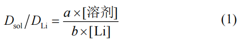 根据式(1),当[溶剂]/[Li]= 1.0 时,a/b=0.9为定值,假设a/b不变,如果[溶剂]/[Li]=0.8时,锂离子浓度相对溶剂浓度是增加,可得Dsol/DLi=0.72,如果数值小于0.72表明DLi变大,锂离子扩散系数相对溶剂扩散系数是变大的,在图上表现为在斜率为a/b直线的下方;如果数值大于0.72表明DLi变小,锂离子扩散系数相对溶剂扩散系数是减少的。在图上表现为点在斜率为a/b直线的下方。