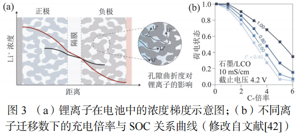离子在移动过程中会产生离子电流,某一离子电流占整个溶液离子电流的分数被称为该离子的迁移数。电池在充放电过程中,锂离子在电解液中将会产生浓度梯度,浓度梯度的出现将导致离子迁移数出现差异。随着充电电流的增加差异将不断变大。