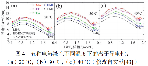 WU等研究了不同电解液溶剂对锂离子电池快充性能的影响。以1.2mol/L LiPF6为溶质,以EMC、EC为主溶剂,加入不同种类的其他溶剂作为共溶剂,考察不同溶剂配方对电芯快充性能的影响。这些共溶剂包括DMC、MA、EA和EF。溶剂体积配比为EC∶EMC∶共溶剂=30∶50∶20。在20、30、40℃温度条件下,不同溶剂配方电解液的离子导电性大小顺序为MA>EF>EA>DMC,如图4所示。相关分析认为是由于溶液黏度变化导致电解液性能的不同,低黏度溶剂能够有效降低电解液中离子运动引起的扩散阻抗。