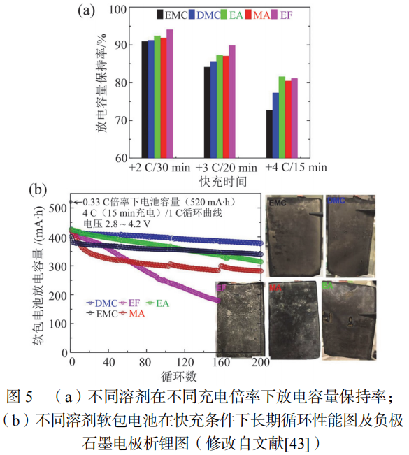 为测试不同配方电解液对快充电池性能的影响,WU等制备NMC622/石墨软包锂离子电池,电池容量为520mA·h,经过化成定容等制程后成为待测软包电池。图5(a)是软包电池在2C、3C、4C倍率下充电后放电容量相对于1C充电倍率下放电的容量保持率柱状图。在4C倍率充电条件下性能优劣关系为EA>EF>MA>DMC>EMC,相关结果差异是由于这些混合溶剂的离子导电性不同引起。高导电性溶剂能够缓解锂离子浓差极化,保持锂离子浓度的相对均匀性。