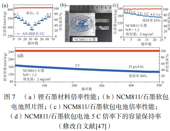 在EC/DMC体系电解液中每个锂离子周围被4个EC分子包裹形成溶剂化锂离子。而在HCE和DHCE电解液体系中每个锂离子周围分别被2.28和2.19个AN分子包裹,这些溶剂化的分子式分别为Li+(EC)4和 Li+(AN)2(FSI−)。这些溶剂化锂离子的结合能如图6(b)所示。溶剂化Li+-EC具有最高的结合能,因此该电解液具有最大的去溶剂化能垒。而溶剂化的Li+-AN具有最低的结合能,仅需要较低的能量即可实现去溶剂化过程。因此溶剂化结构为Li+-AN和Li+-FSI的电解液能够改善电池的快充性能。图7(a)是锂石墨材料的倍率性能图,材料在1C倍率下的容量为350mA·h/g,在5C和8C倍率下的容量分别为325mA·h/g和275mA·h/g,容量保持率分别为92.8%和78.6%,显示出优良的倍率性能。所制备的软包电池如图7(b)所示。软包电池的倍率性能优良,在5C倍率下充电的软包电池最终容量保持率为83 %,表明电池具有快速充电的能力。软包电池在5C倍率下进行快速充电,经过500次循环后容量保持率仍在80%以上,进一步说明选用的电解液具有快速充电的特点。因此降低电解液的去溶剂化势垒能够明显改善电池的快充能力。