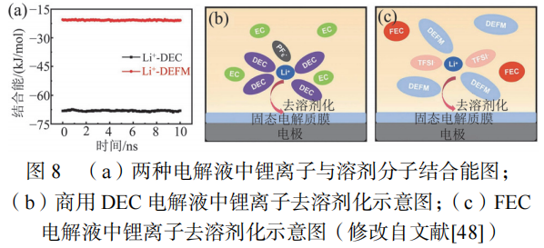 ZOU等研究了两种电解液中锂离子与不同溶剂分子之间的结合能随时间变化趋势及溶剂化分子示意图,如图8所示。图8(a)显示Li+-DEC溶剂化分子结合能为-20.7kJ/mol,而Li+-氟代丙二酸二乙酯(DEFM )溶剂化分子结合能为-67.5kJ/mol。经过计算可知,Li+-DEFM的结合能换算为-0.21eV,小于Li+-DEC溶剂化分子结合能。Li+-DEFM溶剂化的电解液具有更弱的溶剂化结构,有利于锂离子与溶剂分子的拆分。