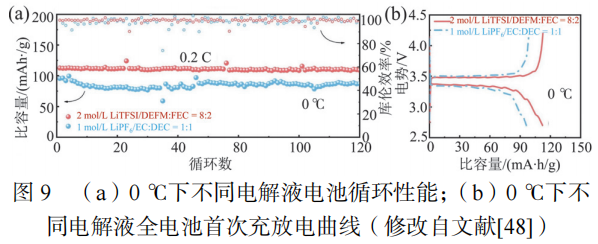 商用电解液中Li+倾向于和DEC溶剂分子配位形成Li+-DEC溶剂壳层,如图8(b)所示,配位对结构紧密结合而难于发生去溶剂化过程。相反,在Li+-DEFM电解液中锂离子与TFSI-是以离子对结构结合,离子对结构发生去溶剂化过程需要的能量要少于配位对结构。为了验证电解液对电池性能的影响,作者测试了两种电解液电池在低温0℃下的循环性能,结果如图9(a)。Li+-DEFM电解液电池在整个循环过程中均表现出稳定的性能,未出现容量保持率的显著波动,电池的首次容量为112.1mA·h/g。而采用商用电解液的电池容量下降明显,首次容量在99mA·h/g左右,如图9(b)所示。因此,改变电解液溶剂成分能够有效降低去溶剂化势垒,提高电池的快充和低温性能。