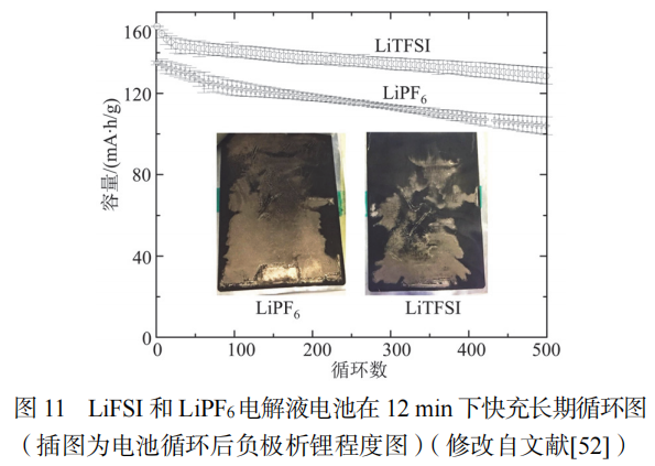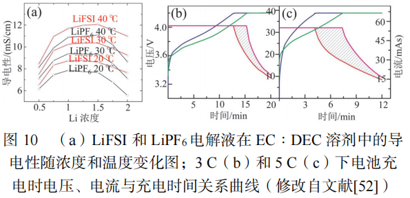 在选用相同的溶剂条件下,不同溶质锂盐对电池的性能也有重要的影响作用。DU等研究了LiPF6和LiFSI溶质锂盐对电池快充性能的影响,如图10所示。图10(a)表明,在20~40℃温度范围,相比于常规LiPF6而言,LiFSI均显示出更高的导电性。不同溶质锂盐具有不同的离子导电性,因此合适的溶质锂盐能够提高电池的快充性能。制约快充电池性能的另一个因素是电池在充电过程中极化变大,表现为电池在充电过程中恒流充电较快结束,电池充电容量大部分是在恒压阶段获得。