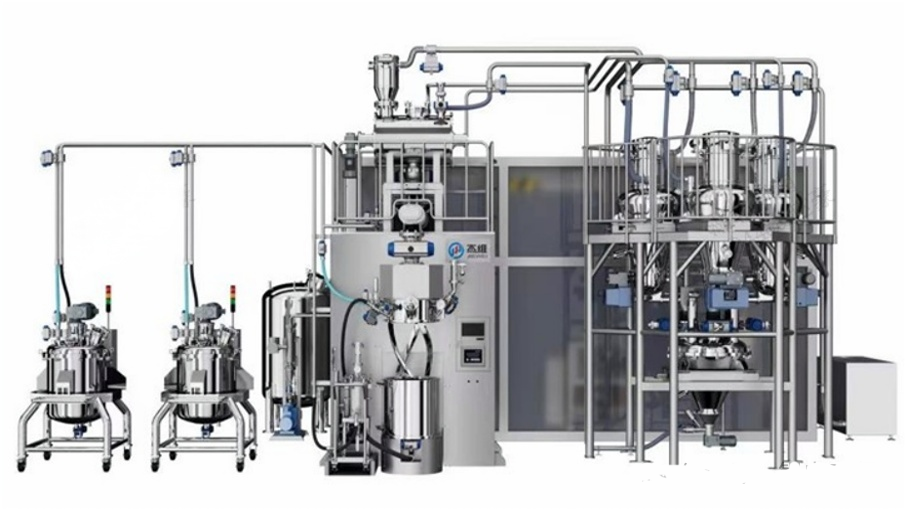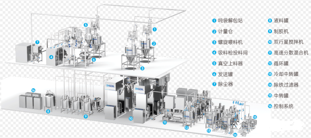 结构特征:包含间歇式预混单元(类似间歇式制浆的搅拌罐等设备)和连续后处理单元(如连续分散机、在线熟化管道等),通过输送泵等设备连接,有中间储料及缓冲装置协调两部分运行。