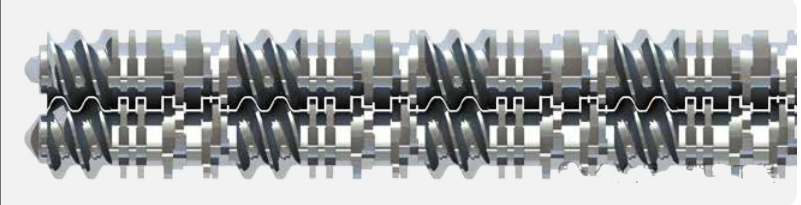 采用同向捏合型双螺杆,物料受到辊压及反向速度梯度作用,形成8字型通道输送,螺杆浮起,避免螺杆与机简摩擦,使物料均匀混合分散;共轭型螺杆,具备良好的自洁性。