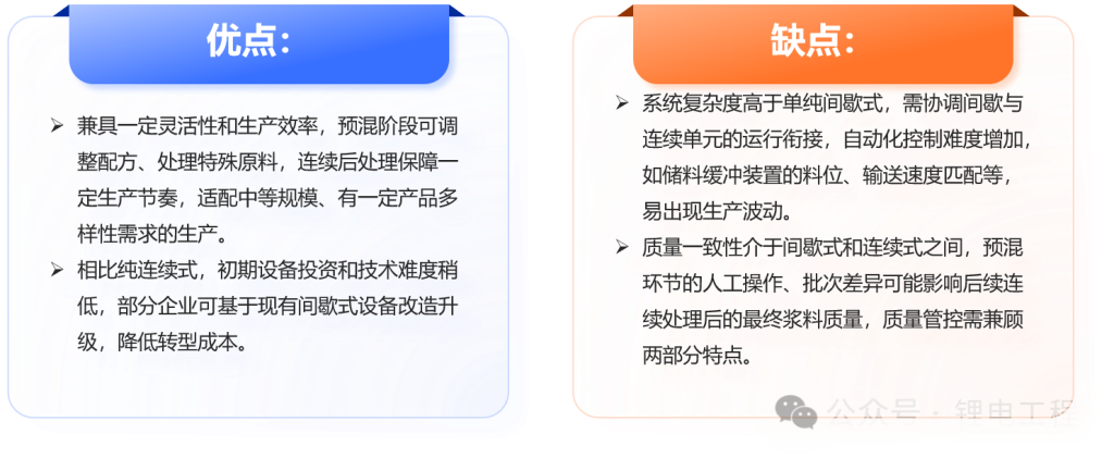 工作原理:结合间歇式和连续式特点,通常先通过间歇式制浆制备一定量的预混浆料(完成部分混合、分散工艺),再将预混浆料连续输入后续连续处理单元(如进一步剪切分散、熟化等),实现半连续生产模式 。