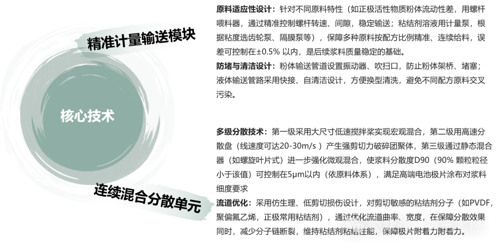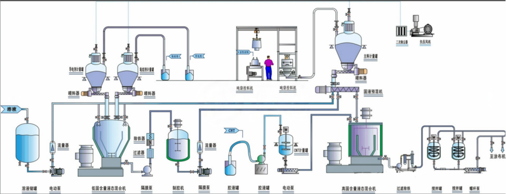 原料经精准计量后,连续进入混合分散单元,依次完成初步混合、高剪切分散、静态混合,形成初步浆料;随后进入在线熟化管道,在设定温度(如40℃ )、流速下(通过管道长度和输送泵控制停留时间,如2小时)完成熟化;熟化后浆料经在线过滤(精度5μm 滤芯 ),去除杂质,输送至涂布工序储料罐,全程连续不间断,生产节拍可达每小时几吨至几十吨浆料(依产线规模 )。