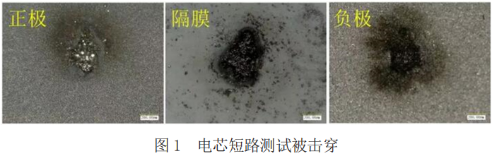 由于隔膜都存在一定的耐电压强度,当加载电压过高时能够击穿隔膜,形成漏电流。因此,首先电芯绝缘测试电压要低于击穿电压。当正负极之间不存在异物时,在测试电压下漏电流小于规定值,判定电芯合格。而如果正负极之间存在一定尺寸的异物,隔膜会被挤压,正负极之间的间距减小,击穿电压下降,如果还加载相同电压,漏电流可能超过设定的警报值。通过设定测试电压等参数,就可以统计分析判断电芯内部的异物尺寸。一般情况下,隔膜越薄,耐电压强度越低,测试电压理论上也应该更低。隔膜含水量过高时也容易形成较大的漏电流。如果测试电芯内部存在异物,可能造成内部短路,电芯被击穿,如图1所示。
