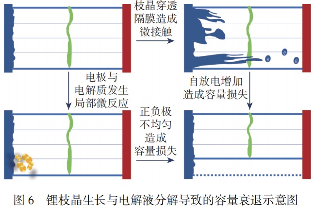Norin等认为隔膜老化的原因来自于电解液的分解产物及活性材料堵塞了隔膜孔,且该过程会导致阻抗上升和功率能力下降。隔膜老化的主要原因除电解质的侵蚀、穿过隔膜孔的锂枝晶及高温或循环引起的结构退化之外,电解质分解产物在隔膜表面的不均匀沉积同样会导致隔膜离子导电能力下降。Wu等对隔膜损伤及老化的机理进行了分析,认为隔膜损伤的主要原因是析锂过程中产生的枝晶可能会刺穿薄膜,导致电池容量下降甚至内短路,在隔膜表面采用不对称修饰的方法能够有效抑制锂枝晶的生长并提升隔膜寿命。